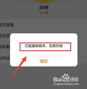 返回到微博页面,点击“版本更新”,就会弹出对话框“已是最新版本,无需进级”(如下图)