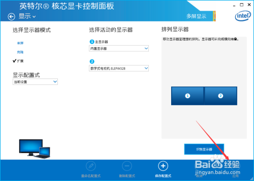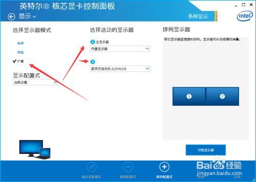 没有第二个显示的环境下只有单屏,我们添加了一个屏幕后选择“扩展”这一项。然后设置一下本家儿屏和次屏两项。即可。