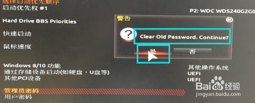 这样,就会弹出断根BIOS密码的提醒窗口,确定;