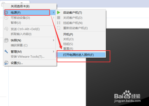 启动虚拟机,主动进入pe系统,若有无法进入者确认镜像无问题,则可封闭虚拟机后再虚拟机页签上点击右键,再电源处点击右箭头,选择最后一项‘打开电源时进入固件’。然后再BOOT项设置为从CD启动。