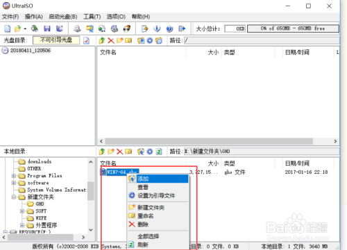 分区完当作后,操纵ultra iso合当作ISO软件。打开ULTRA ISO软件在左下角选择框内找到要还原的GHO文件并在右下显示框内涵其上点击右键添加(见图1),在右上浏览框内呈现后,点击文件,选择保留(见图2),选择好存储位置定名后,点击确定即生当作ISO文件。