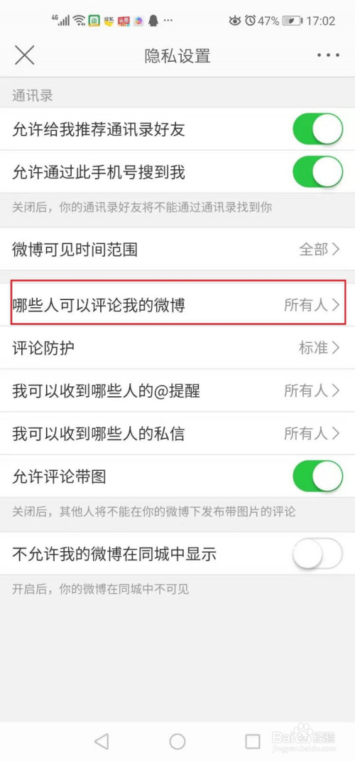 进入隐私设置界面,我们找到列表中的【哪些人可以评论我的微博】按钮点击进入;
