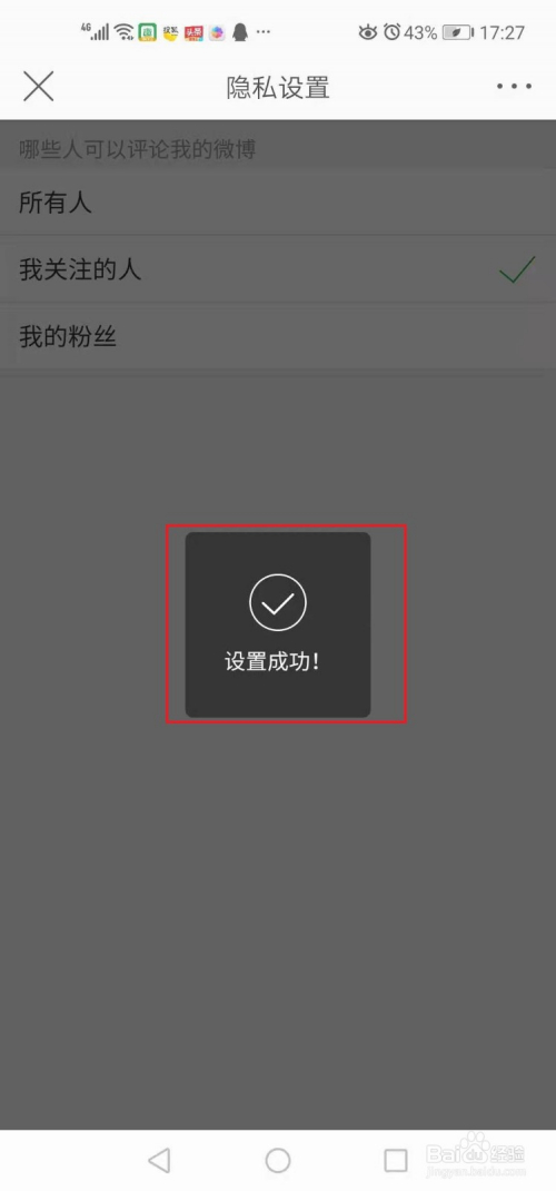 设置当作功之后,界面就会呈现设置当作功的提醒,我们在利用微博过程中就会发现只有你存眷的老友才能进行对你的微博进行评论。