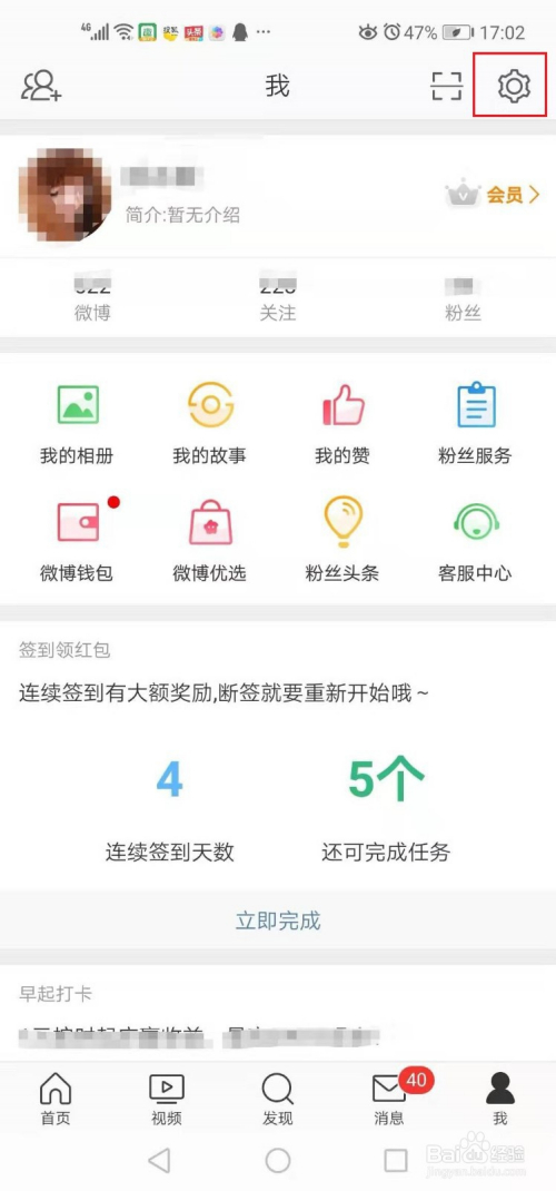 进入微博小我中间页面,在该页面右上角点击【设置】图标按钮;