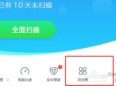 然后我们接下来要做的是给电脑杀毒,用360、金山毒霸都可以,本人电脑自带是金山毒霸,就默认选这个。打开首页,找到百宝箱。