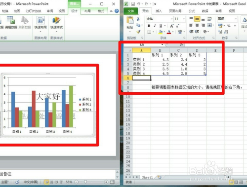 第六步,此刻界面会呈现两个文档,一个是你之前的PPT文档,还有一个是Excel文档,目标是在右边输入表格内容然后会响应的有图表呈现在左边,最后输入完毕后关失落Excel文档即可完当作啦!