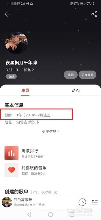 第四步进去小我本家儿页之后,可以看到账号注册时候,也就是网易云音乐我们用了多久,如下图所示: