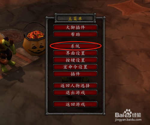 在游戏界面按Esc键,调出本家儿菜单,点击“系统”;