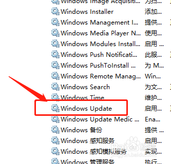 我们将办事选项中的菜单继续下拉,找到W开首的英文:windows update,这句话的意思是天天都要更新。