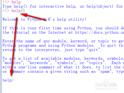 输入help,弹出了提醒:Type help() for interactive help, or help(object) for help about object.需要交互式的帮忙的话输入help;需要查看某个对象的帮忙的话用help(对象)。