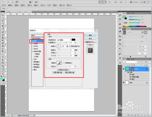 双击图示自界说图案图层,弹出图层样式设置栏。按图示设置出凹凸结果的各个参数;