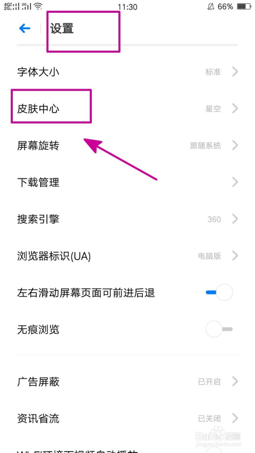此时该应用系统设置页面就会呈此刻手机上,选择该设置页面中的皮肤中间功能;
