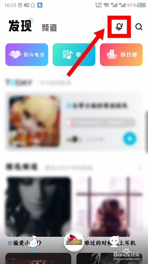 在酷狗音乐概念版发现界面,选择右上角的麦克风图标。如图所示