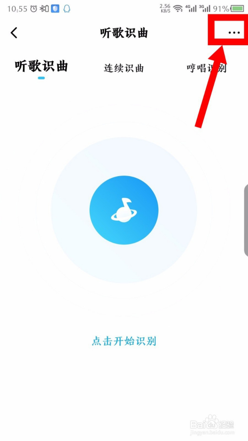 打开听歌识曲界面后,再点击右上角的三点图标。如图所示
