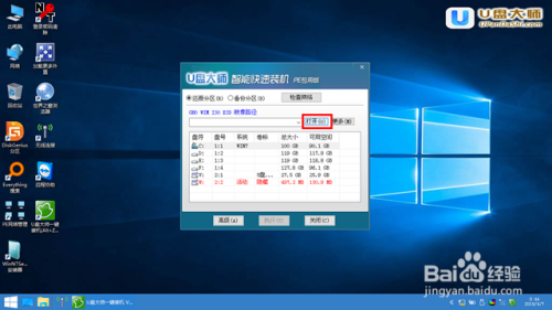 1、进入PE系统后,在PE系统的桌面上,双击打开"U盘巨匠一键装机",点击"打开"按钮。