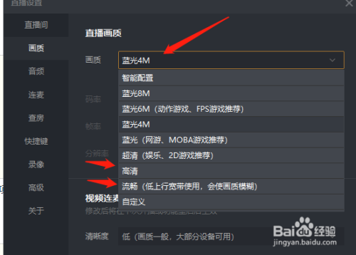 将“画质”调节当作高清或者流利,这样我们固然画质低了一点,不外直播的时辰必定不会卡。