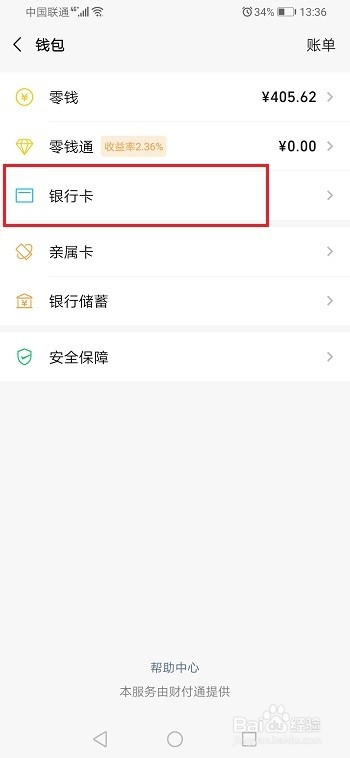 第三步进去钱包之后,点击银行卡,如下图所示: