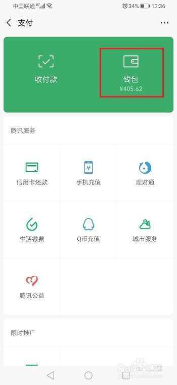 第二步期待3小时或者隔天之后,打开微信,点击支付,选择钱包,如下图所示: