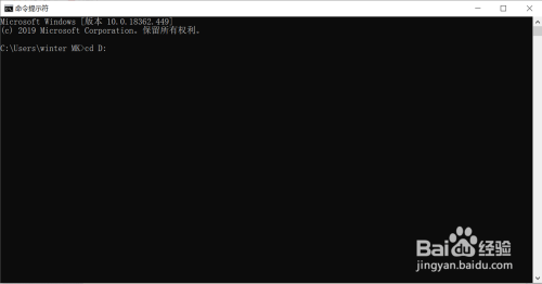 打开后会默认在C盘,而若是我们要进入D盘,可以输入指令cd+空格+D+:,进入下一指令