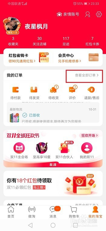 第一步在我们的手机上打开淘宝,进去我的界面之后,点击全数订单,如下图所示: