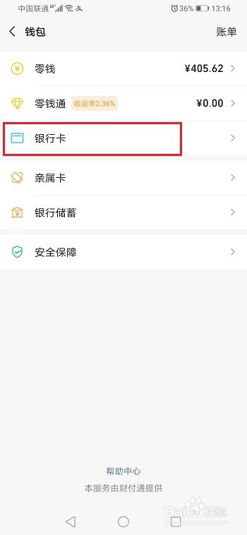第三步进去钱包界面之后,点击银行卡,如下图所示:
