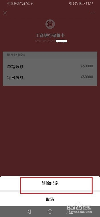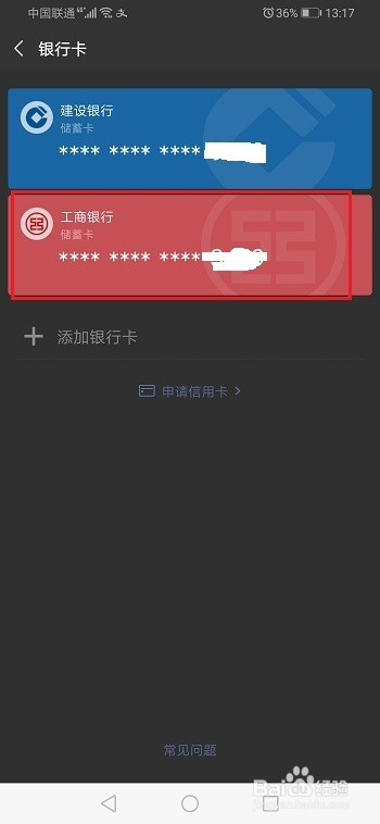 第四步进去银行卡界面之后,选摘要解绑的银行卡,如下图所示: