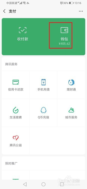 第二步打开微信,点击支付,进去之后,点击钱包,如下图所示: