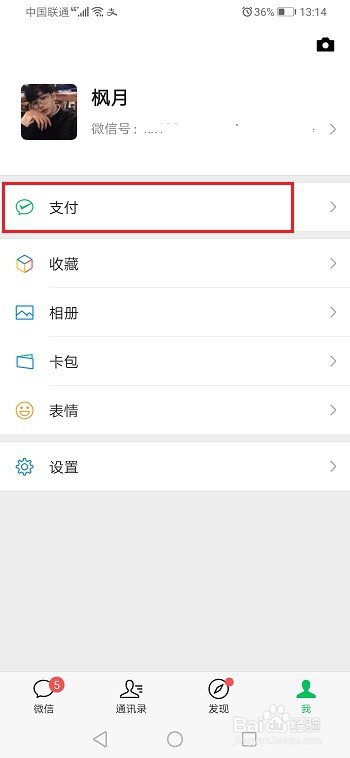 第一步在我们的手机上打开微信,进去我的界面,点击支付,如下图所示: