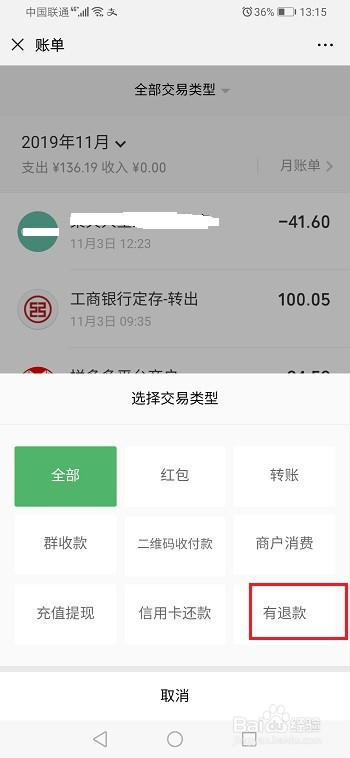 第四步进去账单之后,点击买卖类型,选择有退条目,如下图所示: