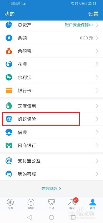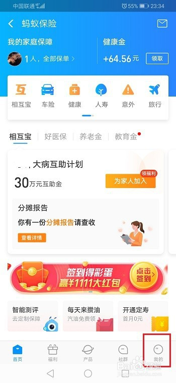第一步打开支付宝,进去我的界面,点击蚂蚁保险,如下图所示:
