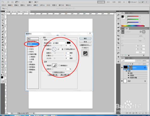 双击图示自界说图案图层,弹出图层样式设置栏。按图示设置出硬壳结果的各个参数;