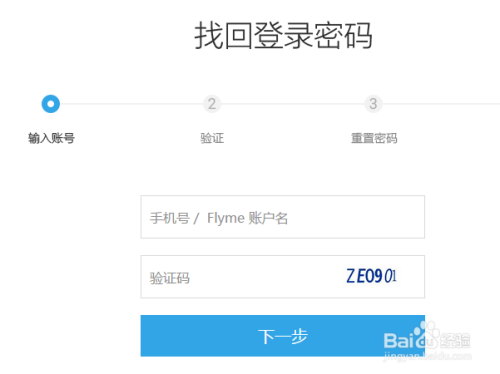 在找回登录密码中,只需要此中输入flyme的账号的信息,输入验证码,点击下一步。
