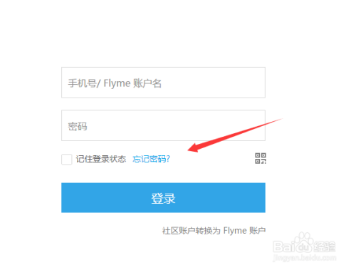 打开魅族的官网,然后点击flyme,进入到登录账号的界面。在点击“健忘密码”。
