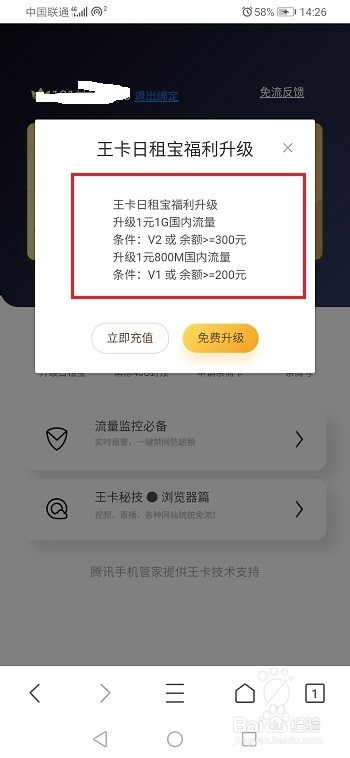 第五步点击免费进级,可以进行进级大王卡日租宝,进级后可以1元1G流量,如下图所示: