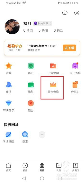 第二步进去qq浏览器之后,在我的界面,点击王卡免流,如下图所示: