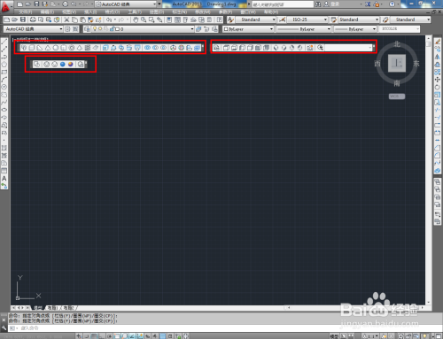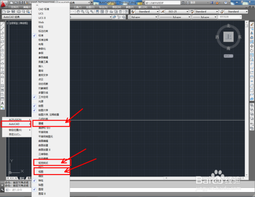 鼠标右键点击图示区域-【AutoCAD 】,依次勾选【视图】、【建模】、【视觉样式】,将这几项东西栏调出;