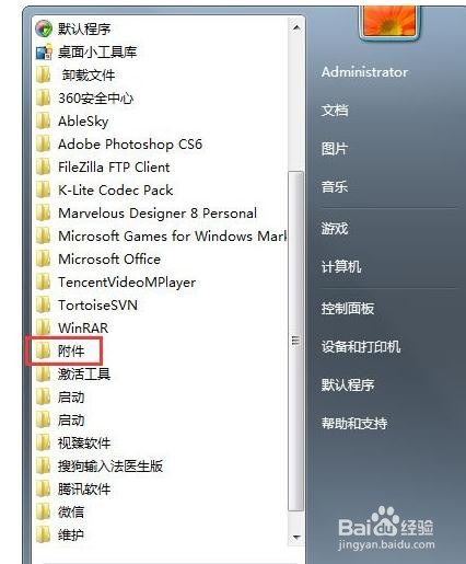 之后点击所有程序,里面的程序良多,慢慢找到里面的附件文件夹;