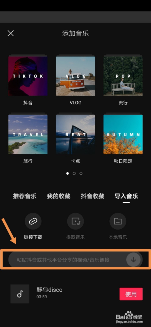 点击“导入音乐”我们会看到搜索框中显示“粘贴抖音或其他平台分享的视频/音乐链接”