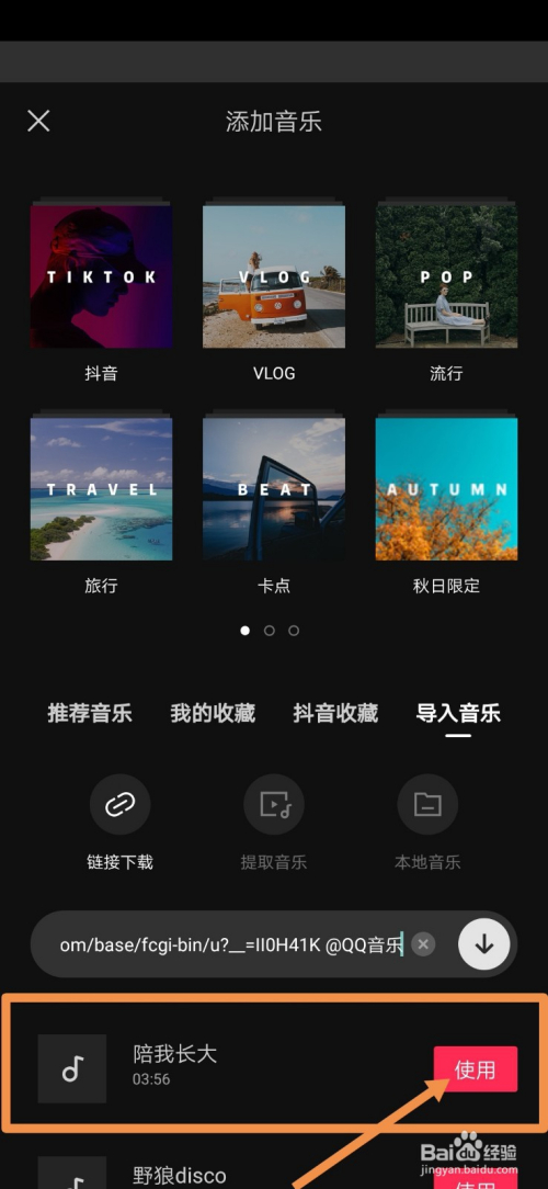 然后切回剪映视频,把方才复制的链接粘贴到搜索框,点击右面的标的目的下的小箭头,下面就会呈现链接的音频啦,点击“利用”即可把音频插手到你的作品啦!