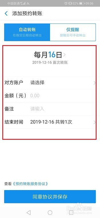 第四步进去之后,选择预约转账的日期和收条目账户,点击赞成和谈并保留,就当作功利用预约转账了,如下图所示: