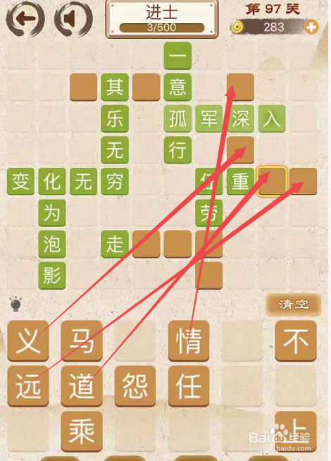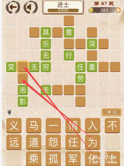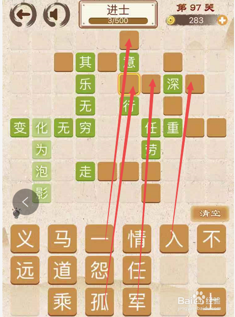 点击当作语消消消手游,起头当作语消消消填字初出茅庐中卷第九十七关的挑战。首先,将底部的“乐”填在“其”和“无”之间,将“穷”填在“无”的下面,构成当作语“其乐无限”。