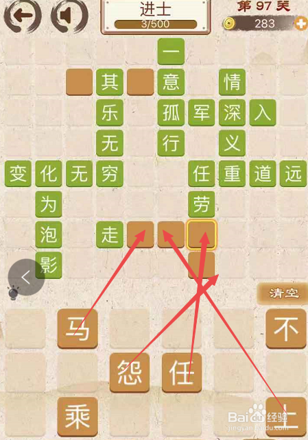 将“任”填再“劳”的下面,将“怨”填在“任”的下面,构成当作语“任劳任怨”,然后将“马”填在底部的“走”的右侧,将“上”填在“任”的左侧,构成当作语“走顿时任”。