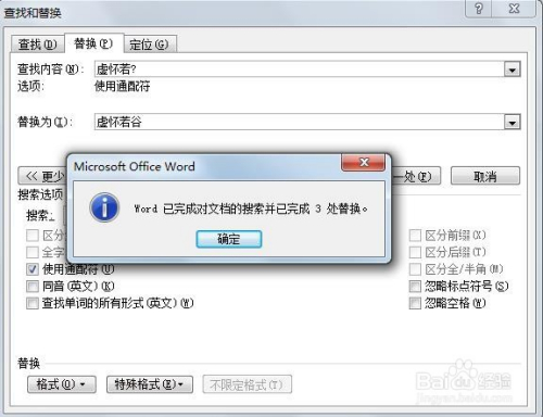 系统弹出对话框提醒:Word已完当作对文档的搜刮并已完当作3处替代。