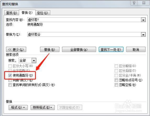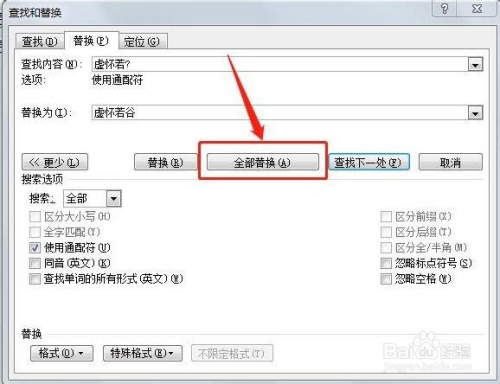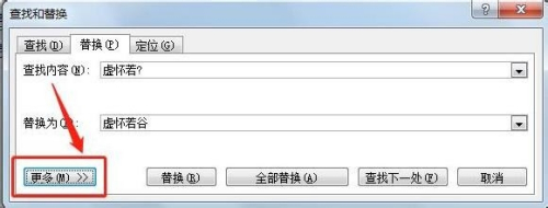 在“查找和替代”对话框中,输入“查找内容”,本例中输入“虚怀若?”,替代为“虚怀若谷”。“查找内容”中利用通配符“?”,错别字用问号替代。