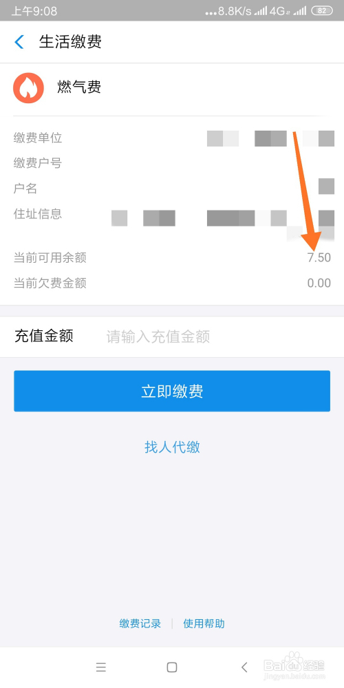 返回燃气缴费界面显示残剩条目已经存入。