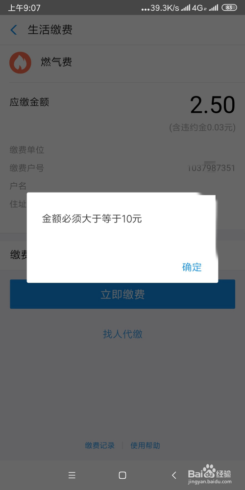 界面显示小于10元不克不及缴费,本次预交10元。