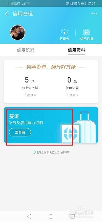 第三步在信用办理的信用资料界面,点击签证,如下图所示: