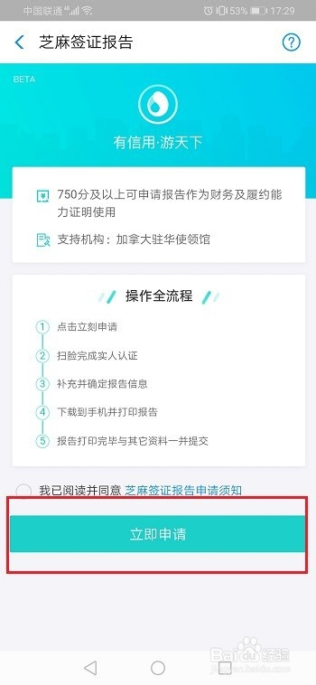 第五步进去之后,勾选赞成打点芝麻签证的和谈,点击当即申请就完当作了,如下图所示: