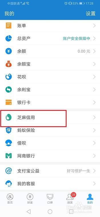 第一步在我们的手机上打开支付宝,进去我的界面,点击芝麻信用,如下图所示: