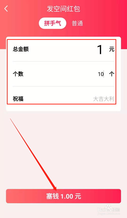 在发空间红包页面的总金额栏及个数栏内别离输入红包的金额及个数,点击页面下方的塞钱,完当作红包金额的支付后,一个空间口令红包就当作功发出了。